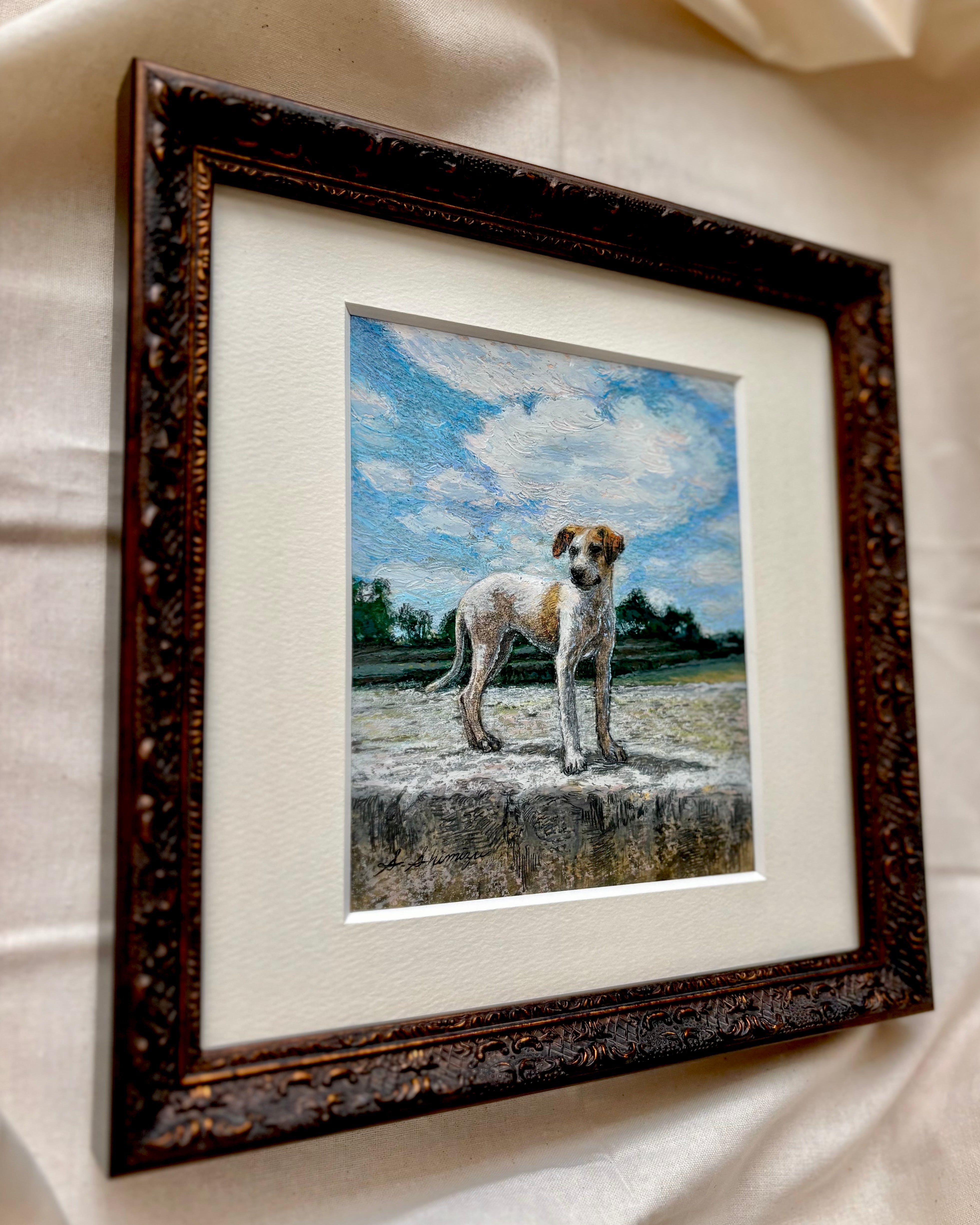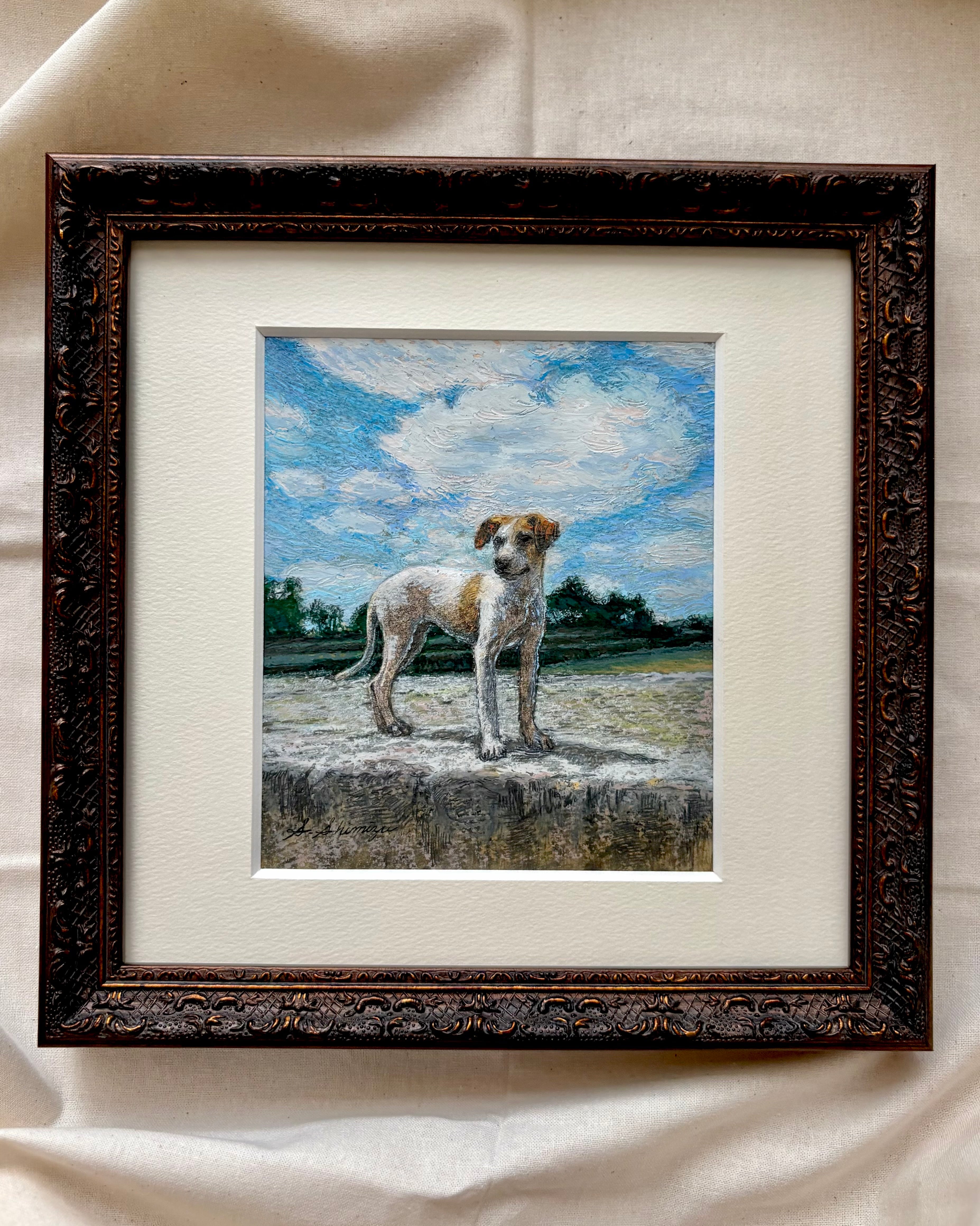 この犬がまとう自由でのびのびとした空気感を見た人にも届けたいという気持ちで描いた作品です。