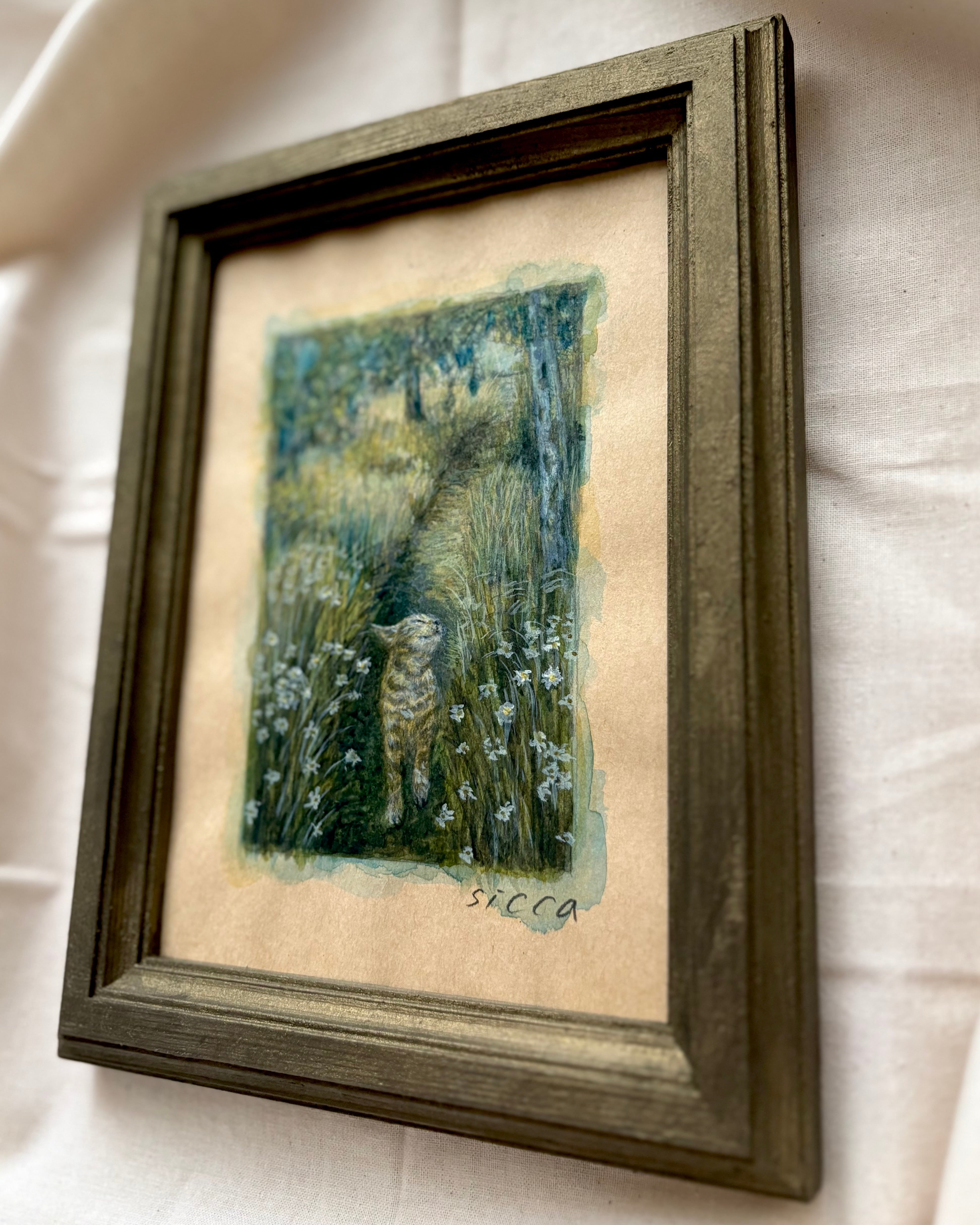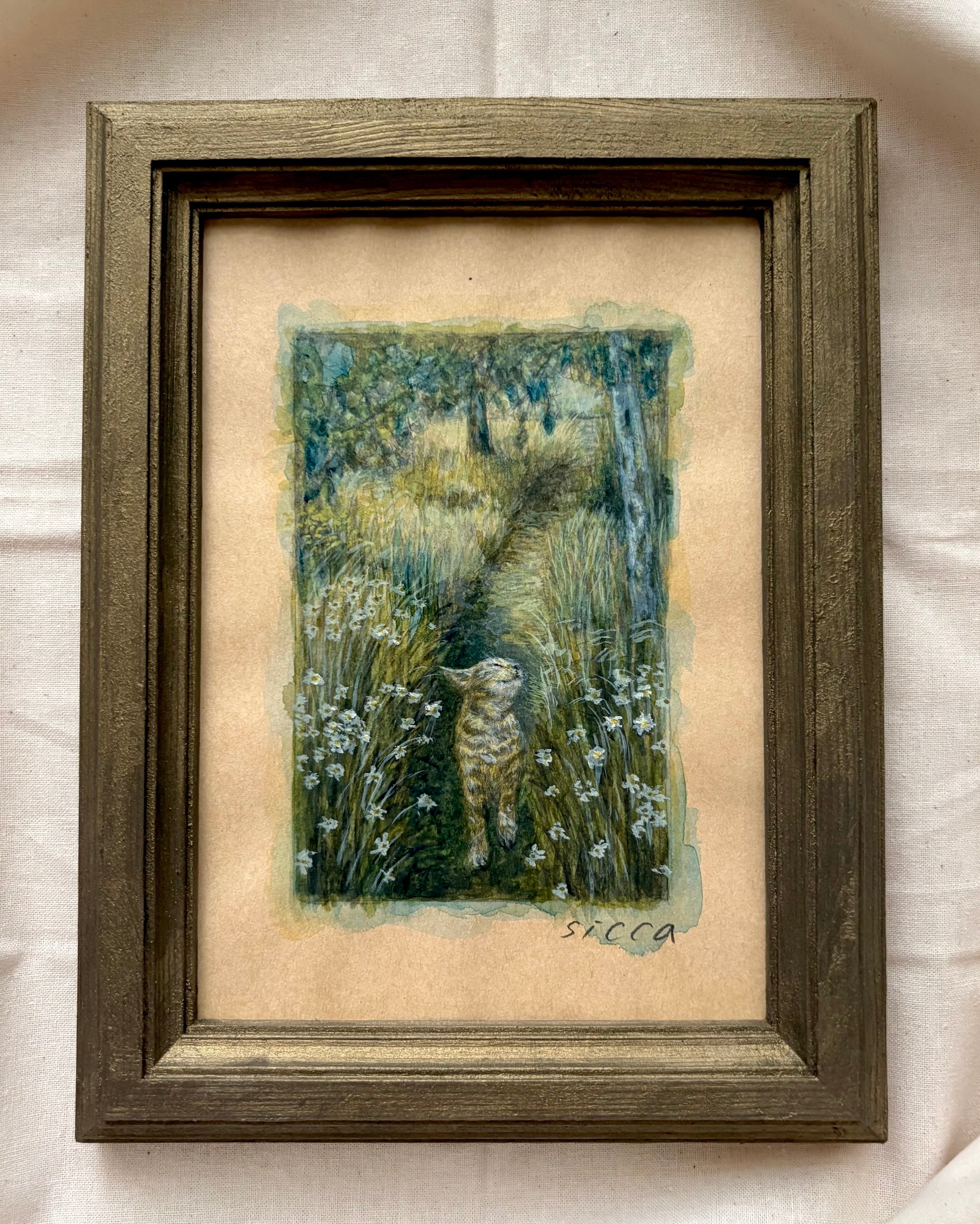 「画家sicca」としてデビューする数か月前、この猫に心惹かれ、描きたいという気持ちだけで、誰かに見せる事を意識せず、楽しく描いた作品です。